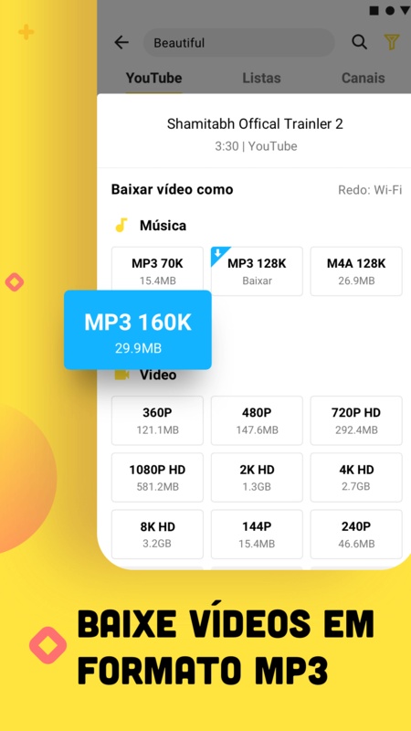 O snaptube oferece uma gama de resoluções incluindo 144p, 720p, 1080p hd, 2k hd, 4k hd e formatos de áudio em mp3 ou m4a.